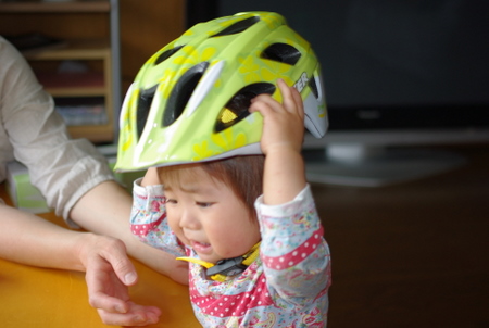 子供乗せデビューに向けてのヘルメット慣らし期間です・・・。やっぱり嫌がるかorz。