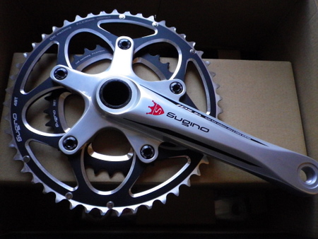 通常のコンパクトでは50*34Tなのでともに-2T軽めに設定。実際にはもっと軽くも重いのも自由自在に組めるメリットがある。このクランク独自のインナー取り付けボルト径(PCD)があるので。ギア歯数の自由度はスギノが一番です。