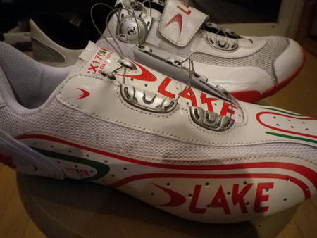 ちょうど左側に見きれてます。カカトを覆うようなソール形状をしていない代わりにカカトを締め付けることができるかのごときBoaシステム。このモデルのカーボンソール版が入荷したら面白いんですけどねぇ・・・。